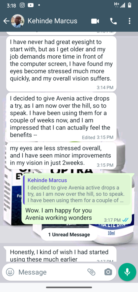 I can not stay in a room with light for up to 2hours. I will need to off the light. This was because light easily affected my eye sight. When i told my doctor about this, he then introduced avenia active to me to start using. He told me i will be cured. After using this product fir just 1 week, my eye problem stopped. I can now stay in a room with light and it will not affect my eyes